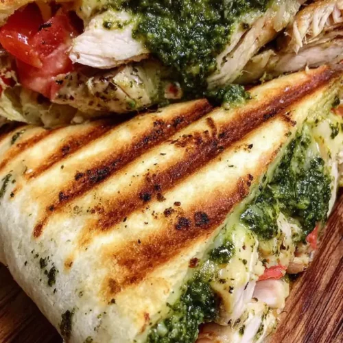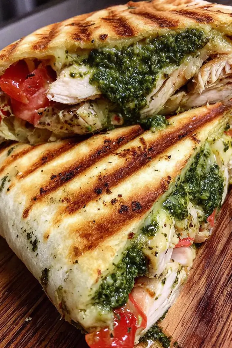 This Amazing Basil Pesto Chicken Panini Recipe combines juicy roasted chicken, vibrant basil pesto, creamy avocado, sweet roasted red peppers, fresh tomato, and melted mozzarella or provolone pressed between crispy golden bread. It’s a warm, satisfying Mediterranean-inspired sandwich perfect for lunch, dinner, or casual entertaining.