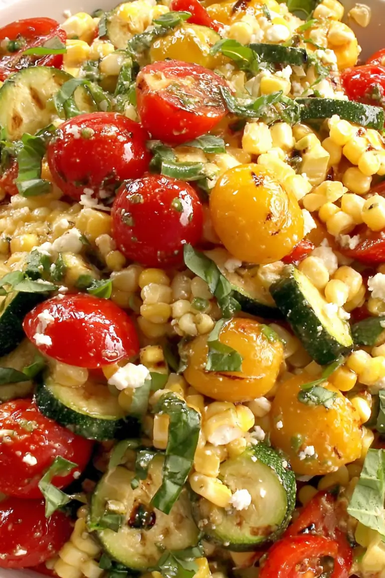 Use fresh seasonal corn and zucchini for best flavor. Do not overcook the zucchini to keep a crisp-tender texture. Let the salad rest 10–15 minutes before serving to allow flavors to meld. Feta can be replaced with avocado for a dairy-free option. Frozen corn may be used if thawed and lightly sautéed or boiled first.