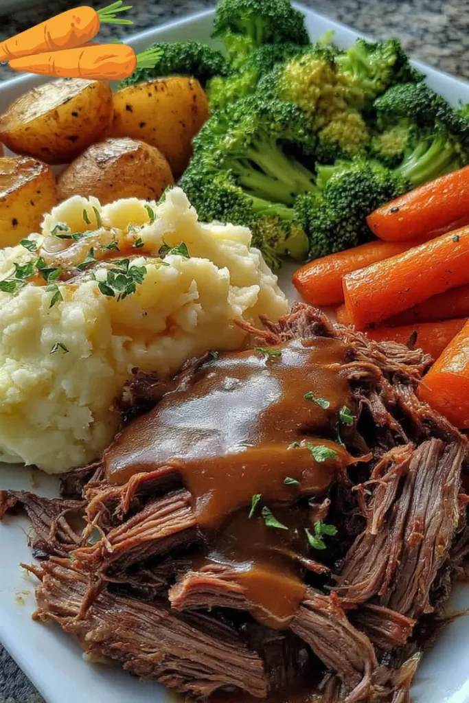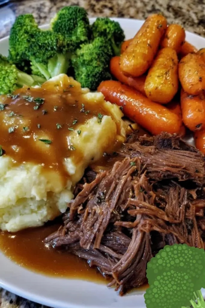 Plate the shredded beef, pour over the rich gravy, and serve alongside creamy mashed potatoes, roasted carrots, and steamed broccoli.