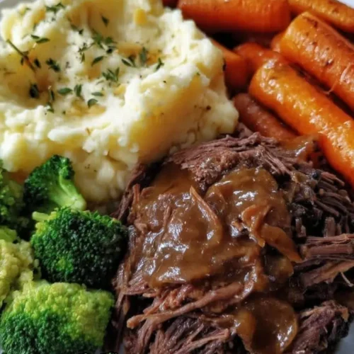 This recipe is a true comfort food classic. The beef becomes fall-apart tender thanks to slow cooking in a Dutch oven, soaking up the savory flavors of garlic, thyme, and a rich beef broth. The homemade gravy adds depth and richness, while the creamy mashed potatoes and perfectly roasted vegetables make each bite a balance of textures and flavors. Whether for a weekend family dinner or a cozy holiday meal, this pot roast hits all the right notes: savory, wholesome, and utterly satisfying.