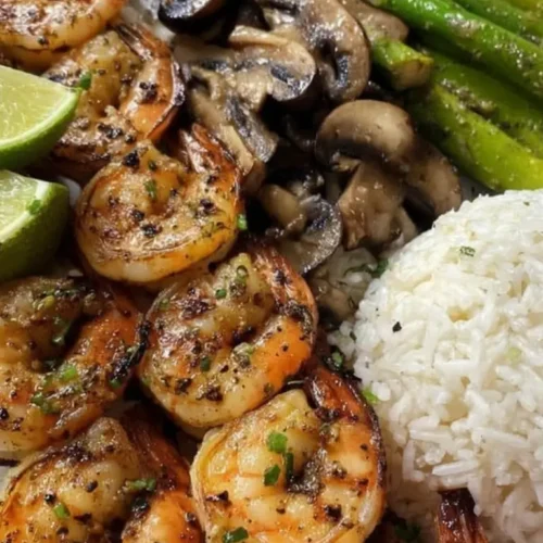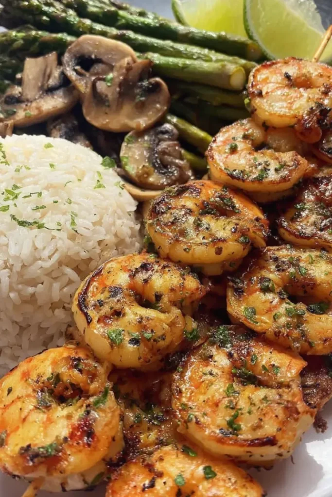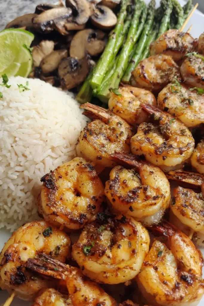 These shrimp skewers are quick to prepare and full of flavor. The shrimp are marinated with garlic and Cajun spices, then grilled to perfection for a slightly charred, juicy texture. Served alongside tender asparagus, mushrooms, and perfectly cooked rice, this meal is satisfying, healthy, and visually appealing. The fresh lime garnish adds a refreshing tang that elevates the dish, making every bite burst with Mediterranean-inspired flavor.