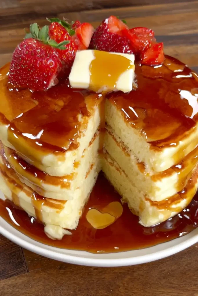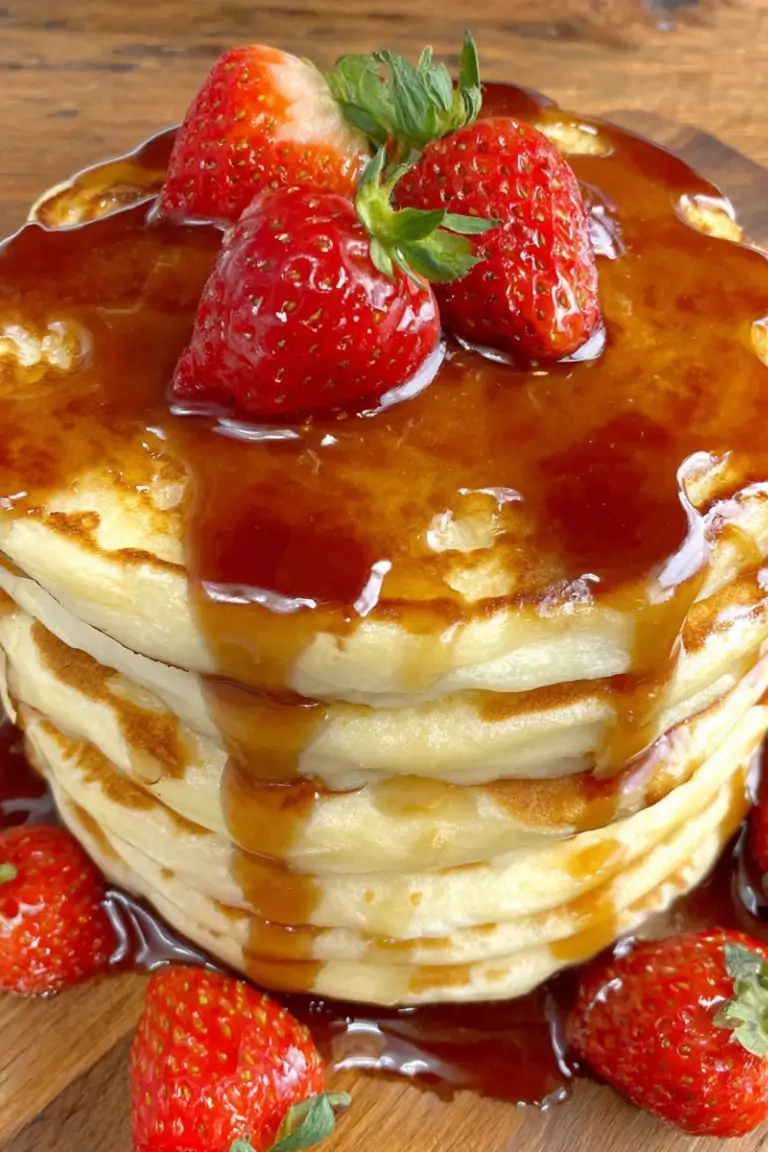 • Stack the pancakes and serve warm with your favorite toppings such as fresh berries, maple syrup, powdered sugar, or whipped cream.