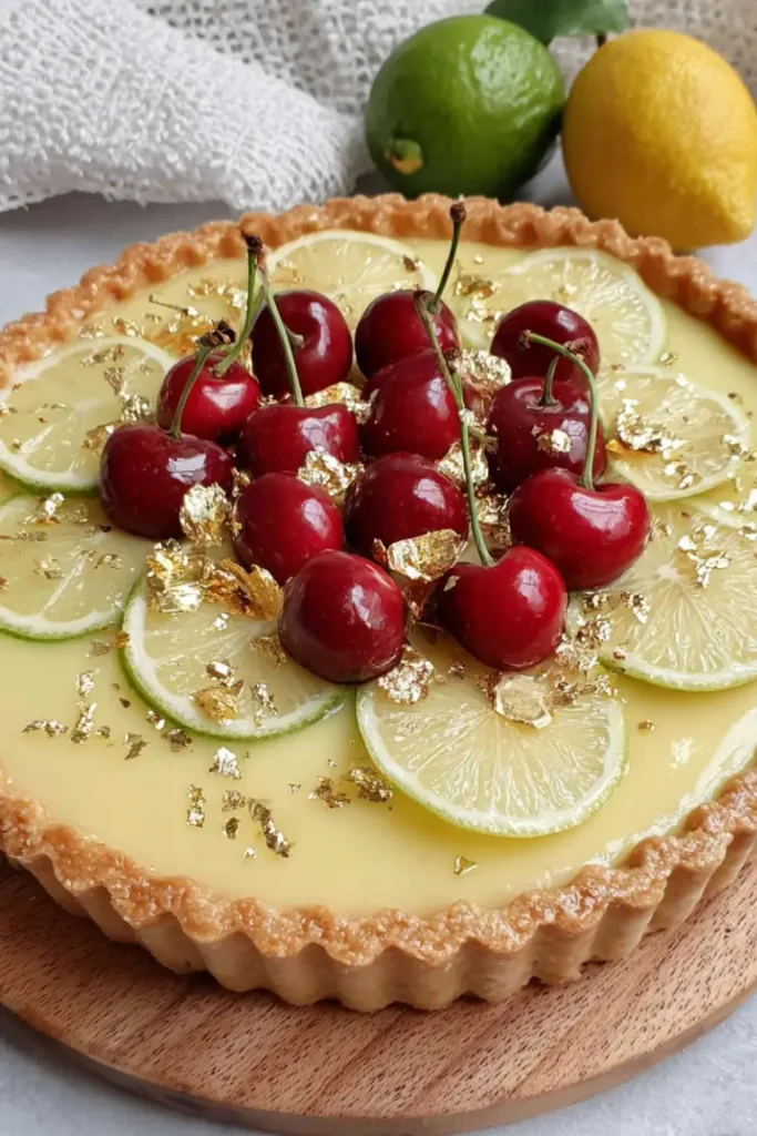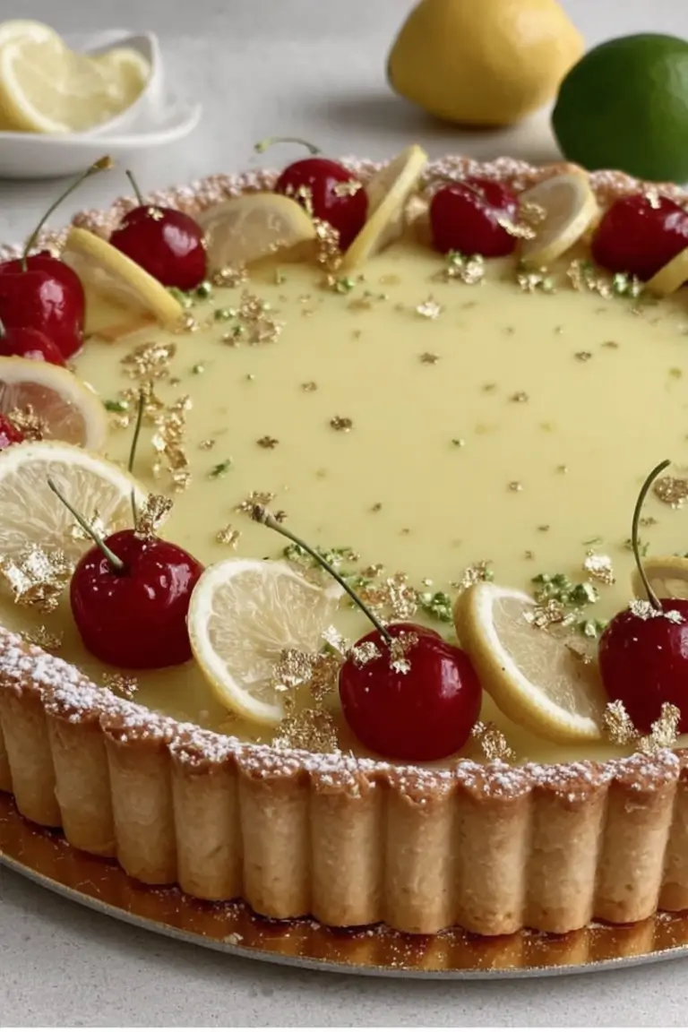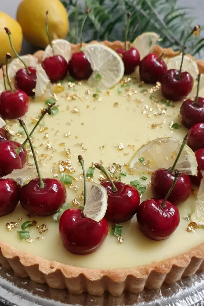 Elegant lemon tart with a buttery crust, smooth tangy filling, fresh cherries, and optional gold leaf. Perfect for celebrations or dinner parties.