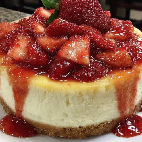 Use full-fat block cream cheese for the best texture. Make sure all dairy ingredients are at room temperature before mixing. Avoid overmixing to prevent cracks. A water bath ensures gentle baking and a smooth surface. Chill overnight for best flavor and texture. If freezing, add the strawberry topping after thawing for optimal freshness.