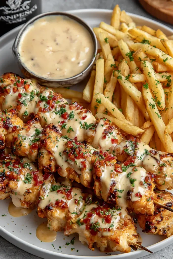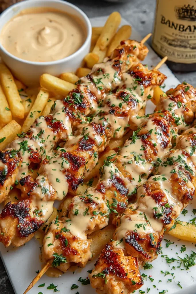 - Drizzle sauce over chicken skewers and serve with fries and extra sauce on the side.