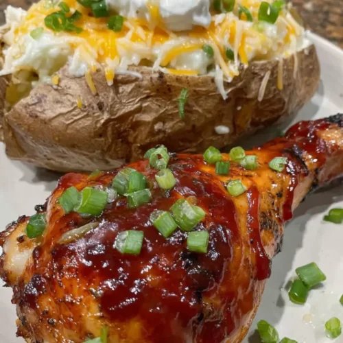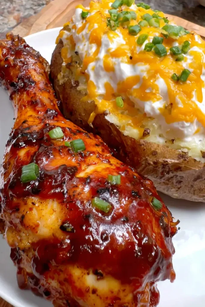 Roasted drumsticks become juicy and caramelized with a rich barbecue glaze, while fluffy baked potatoes are topped with butter, melted cheddar cheese, sour cream, and fresh green onions. The result is a balanced plate with savory, smoky, creamy, and slightly tangy flavors that everyone at the table will love.