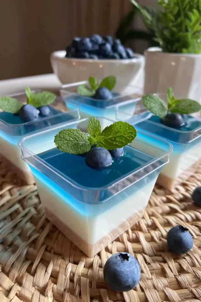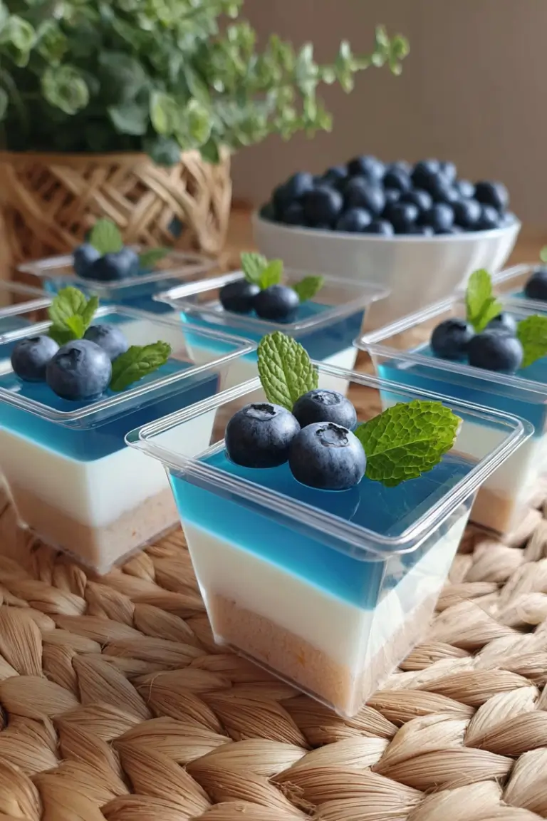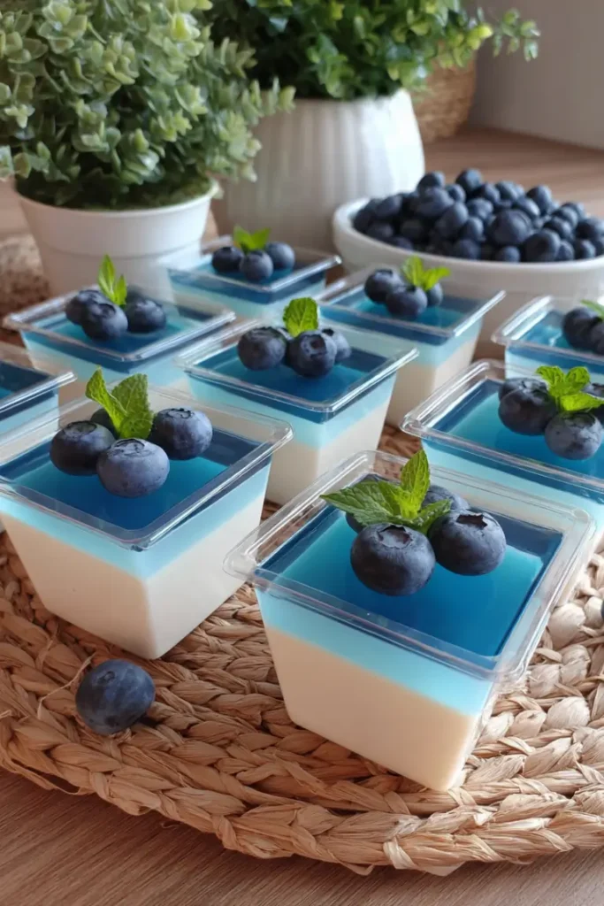 These Easy Blueberry Cream Jelly Dessert Cups are a refreshing no-bake dessert featuring a vibrant blueberry gelatin base topped with a light, fluffy vanilla cream layer. Served in clear cups and garnished with fresh blueberries and mint, this elegant layered treat is perfect for warm days, parties, and simple family desserts.