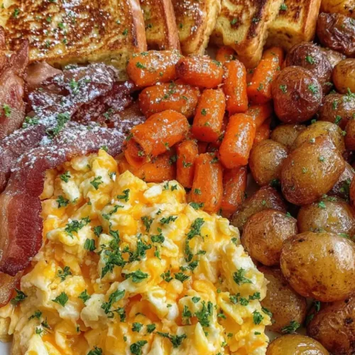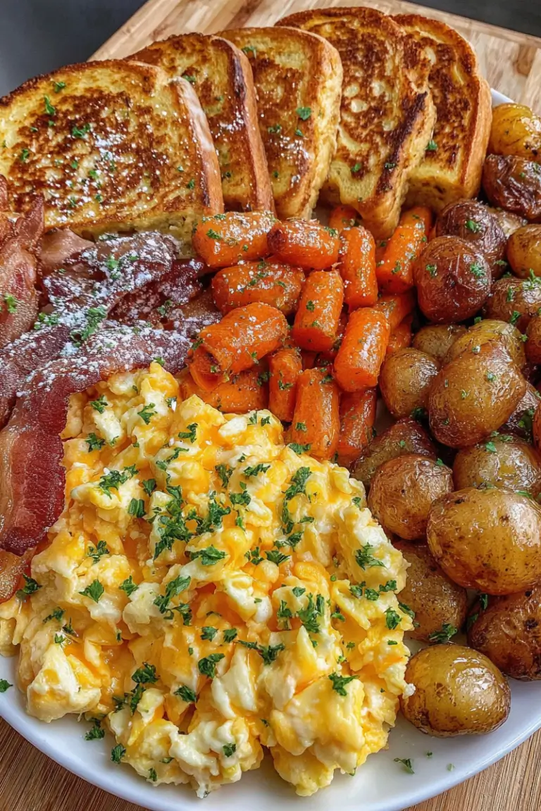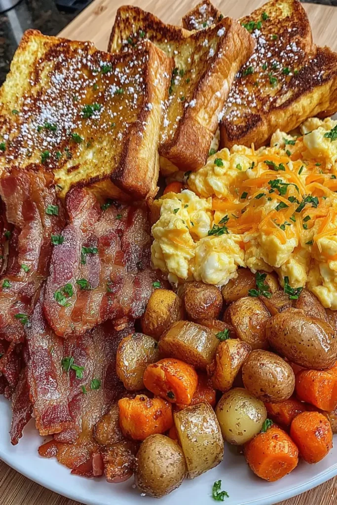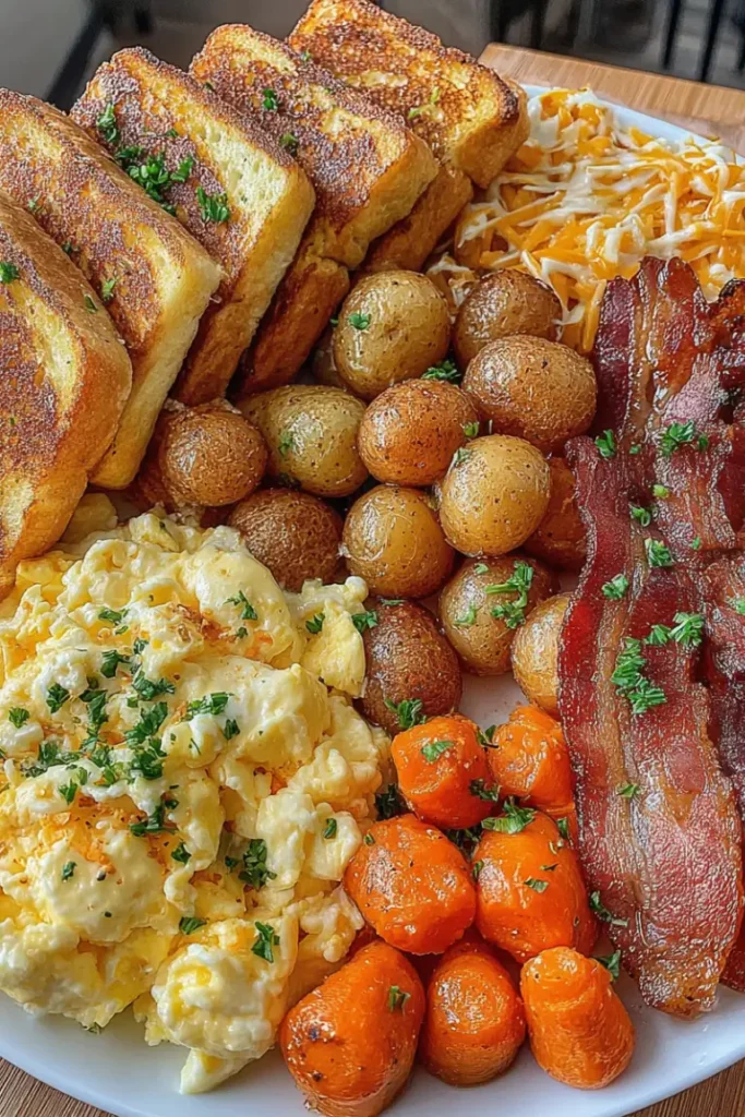 Start your day right with this Easy Cheesy Scrambled Eggs with French Toast Platter, a delicious breakfast that combines sweet, savory, and hearty flavors all on one plate. From fluffy, cheesy eggs to golden French toast and crispy bacon with roasted vegetables, this recipe is a complete morning feast your family will love.