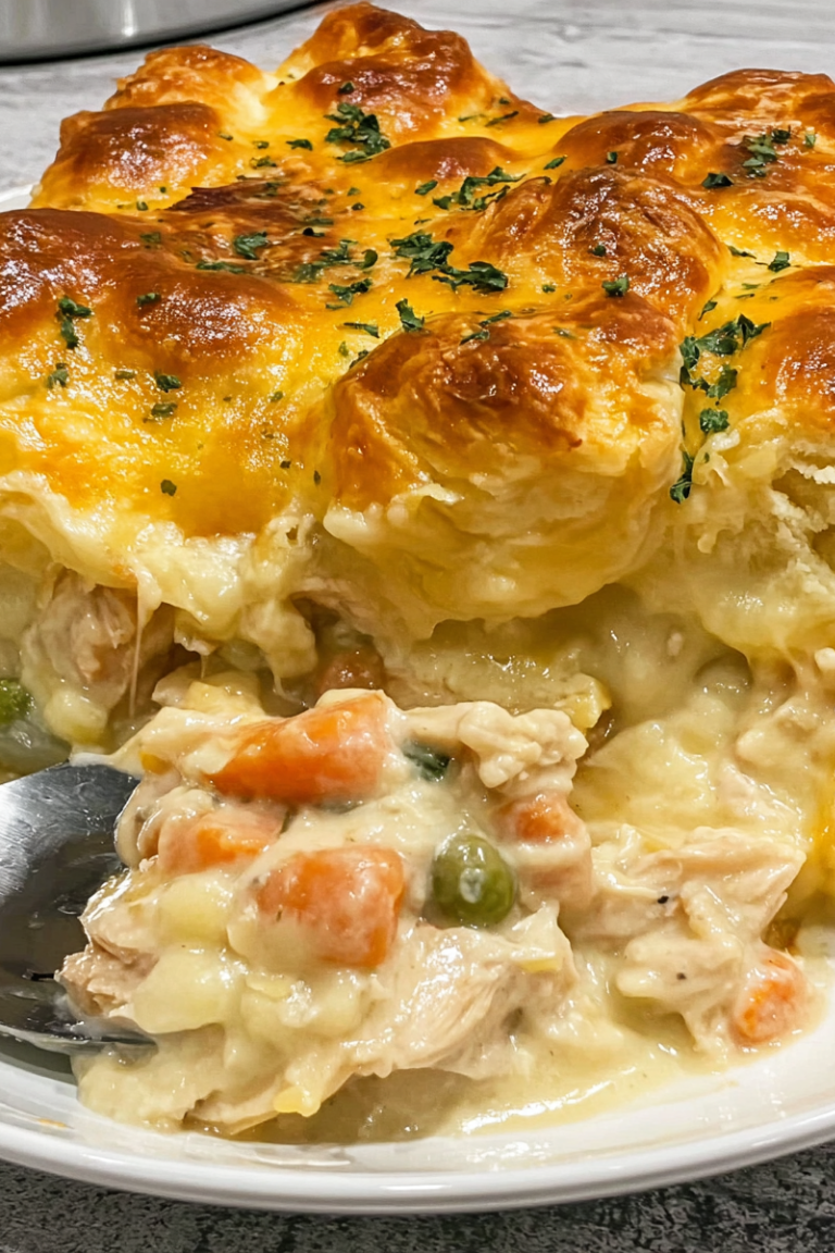 This creamy, comforting casserole features shredded chicken, tender vegetables, and a golden biscuit topping — perfect for weeknight dinners or potlucks. Inspired by classic chicken pot pie, it’s simple to make and feeds a crowd with minimal effort.