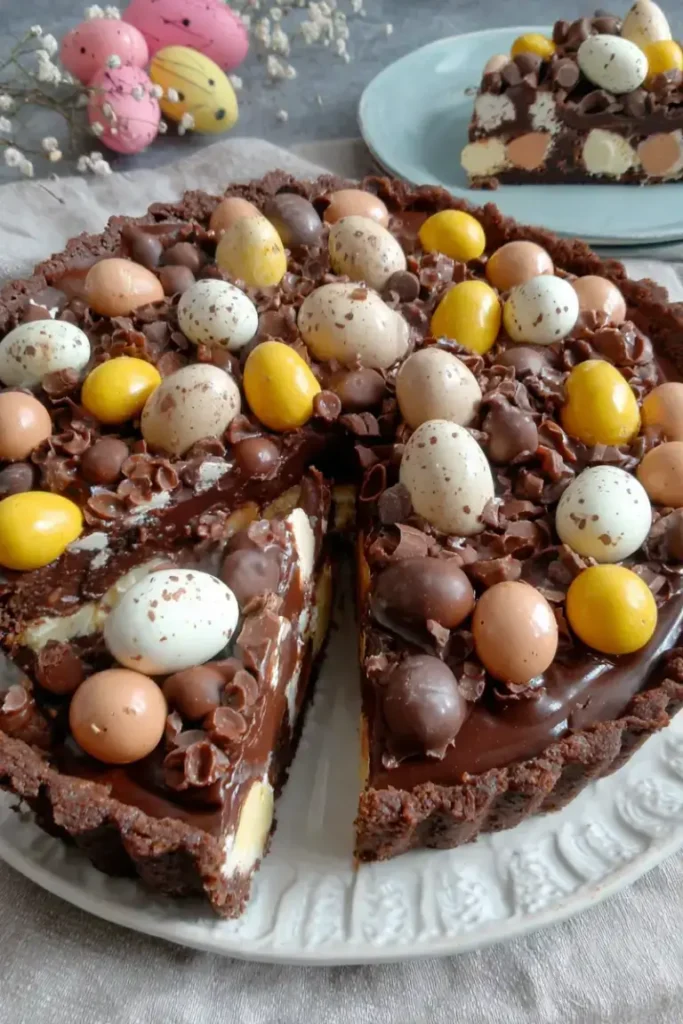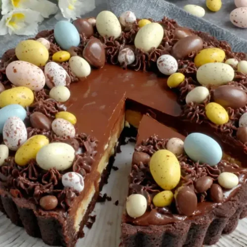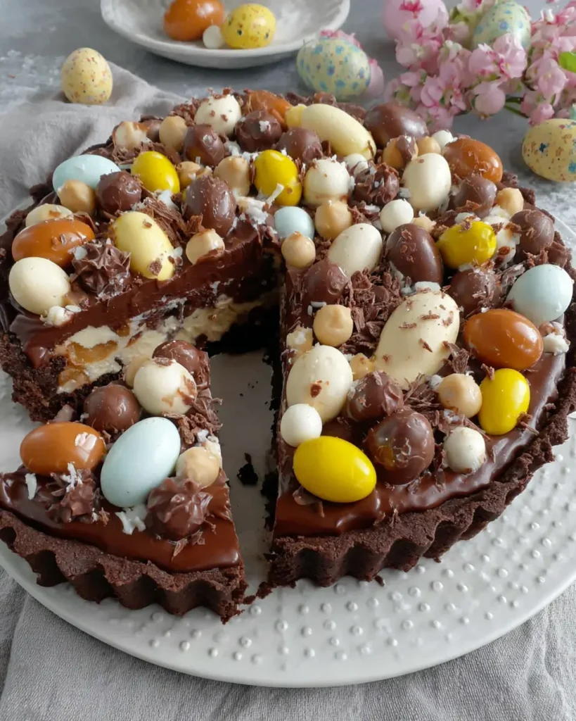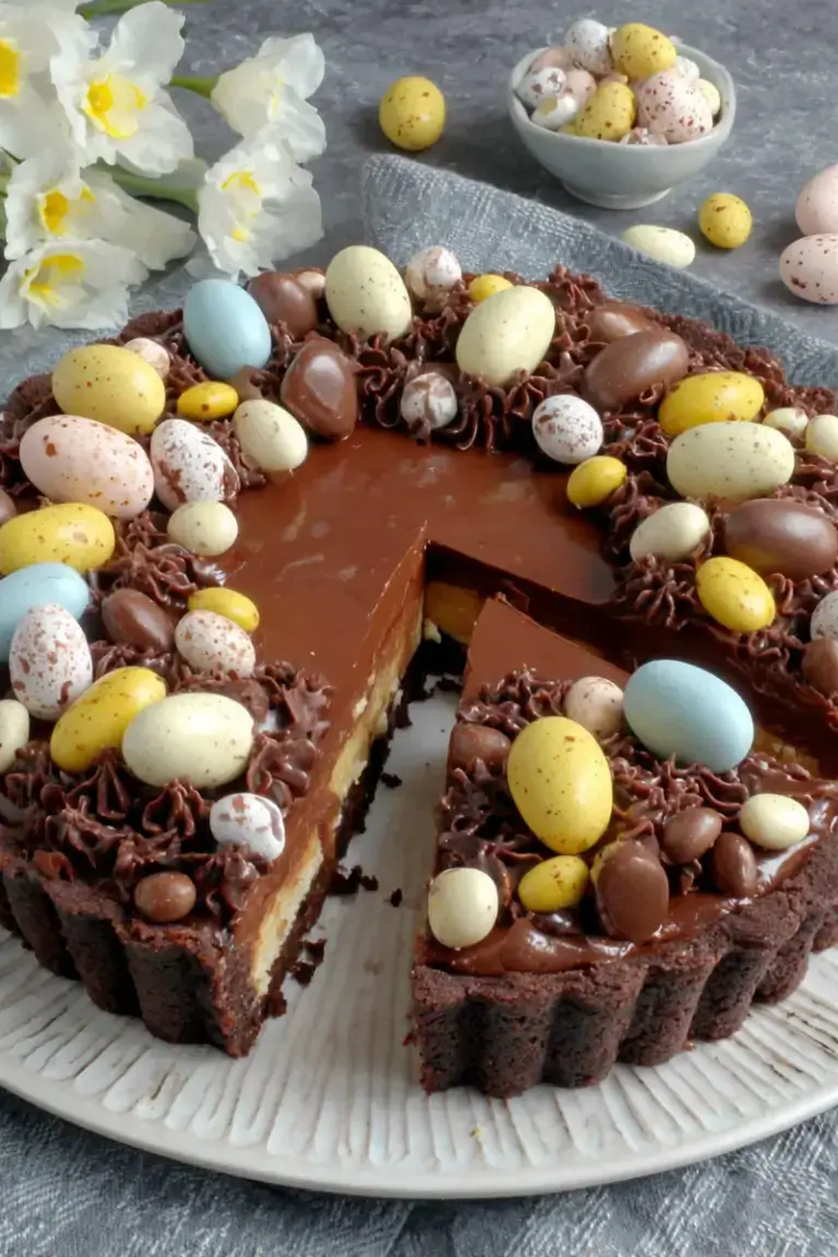 This rich and silky chocolate tart combines a buttery chocolate shortcrust pastry with smooth ganache, topped with whipped cream and festive Easter chocolates. Perfect for holidays or special occasions, it’s elegant yet simple to make.