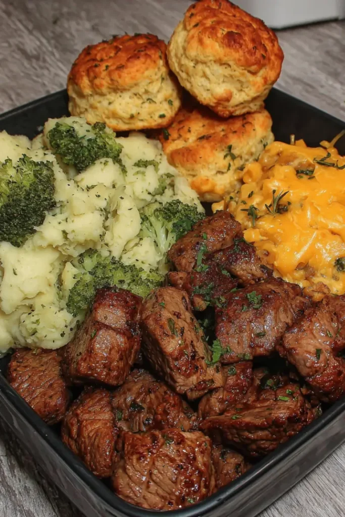 Easy Garlic Butter Steak Bites with Creamy Sides is a comforting, restaurant-quality dinner made right at home. Tender, pan-seared steak bites coated in rich garlic butter are served with fluffy mashed potatoes, cheesy broccoli, and warm cheddar biscuits for a hearty, satisfying family meal.