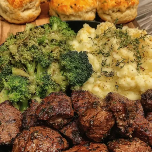 Easy Garlic Butter Steak Bites with Creamy Sides is the kind of comforting, satisfying meal that feels restaurant-worthy but comes together right in your own kitchen. Juicy, pan-seared steak bites coated in rich garlic butter are paired with fluffy mashed potatoes, cheesy broccoli, and warm cheddar biscuits for a complete dinner that’s hearty, flavorful, and family-friendly.