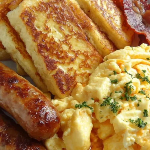 The Easy Golden French Toast Breakfast Platter with Sausage Fluffy Eggs is a comforting and delicious way to bring a classic breakfast to your table. With golden French toast, soft scrambled eggs, savory sausage, and crispy turkey bacon, this platter offers a balanced combination of flavors and textures.