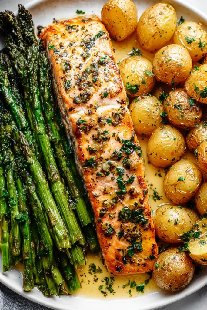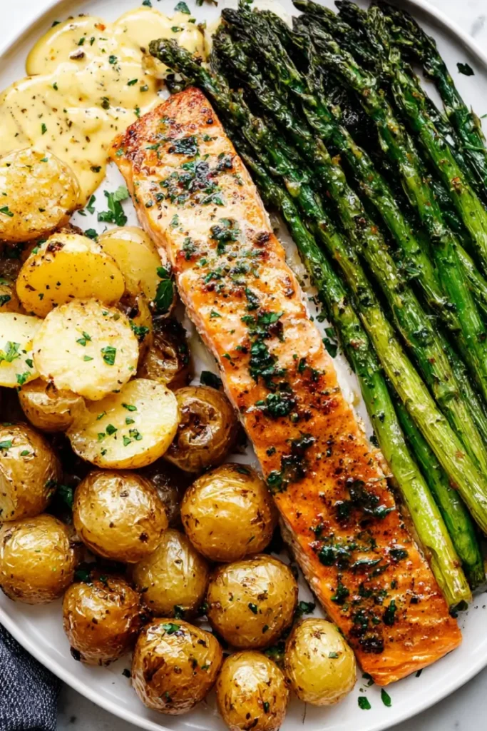 Second, the flavor combination is outstanding. Salmon pairs naturally with lemon, garlic, and herbs, while roasted potatoes add heartiness and asparagus brings freshness and color.