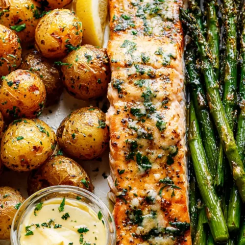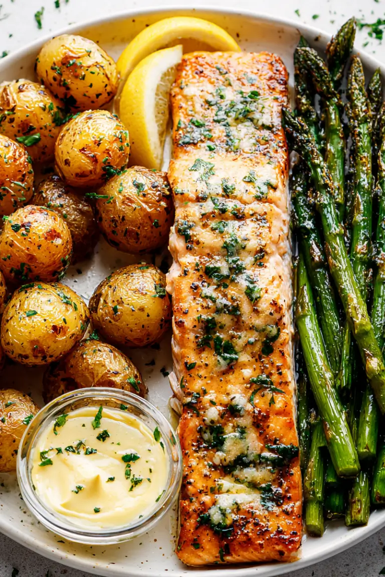 Cooking everything on one baking sheet not only makes cleanup easy but also allows the ingredients to roast together, creating incredible flavor. The potatoes become golden and crispy, the asparagus stays bright and tender, and the salmon absorbs the delicious garlic-lemon butter mixture. The result is a balanced, nutritious, and beautiful dish the whole family will enjoy.