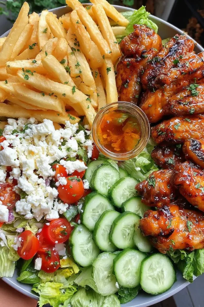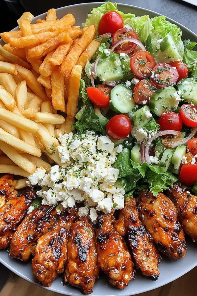 This recipe brings together everything you want in a balanced meal—protein, carbs, and fresh vegetables. The wings are perfectly seasoned with a warm spice blend, grilled to juicy perfection with a slightly charred finish. The fries are irresistibly crispy thanks to a simple cornstarch trick, while the salad adds brightness and freshness.