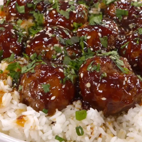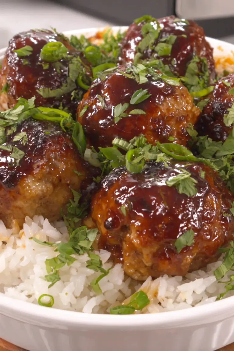 • Arrange the browned meatballs over the rice. Pour the honey garlic sauce evenly over the meatballs and rice.