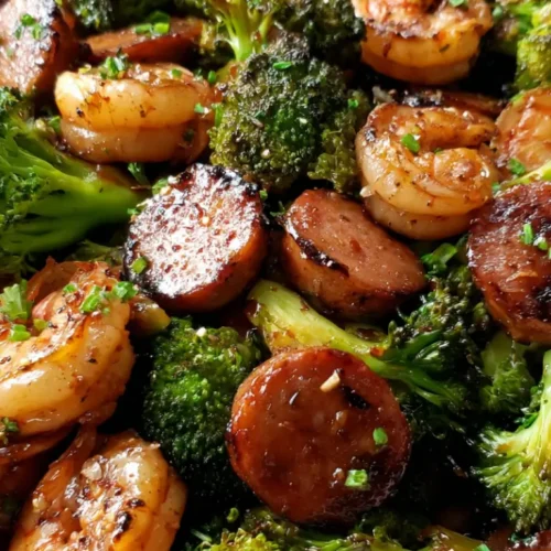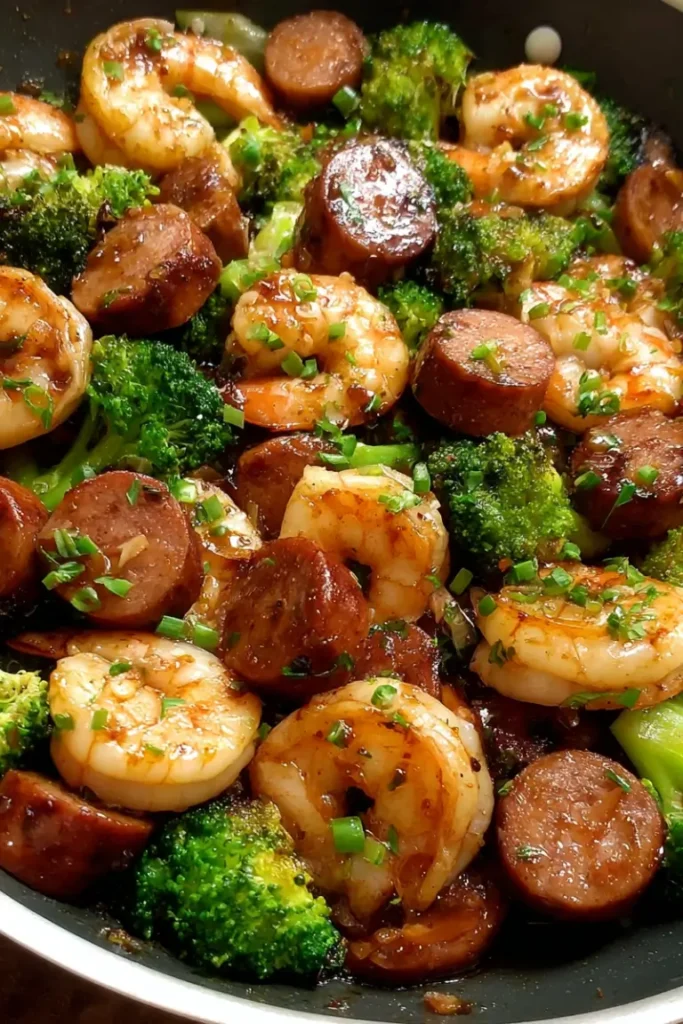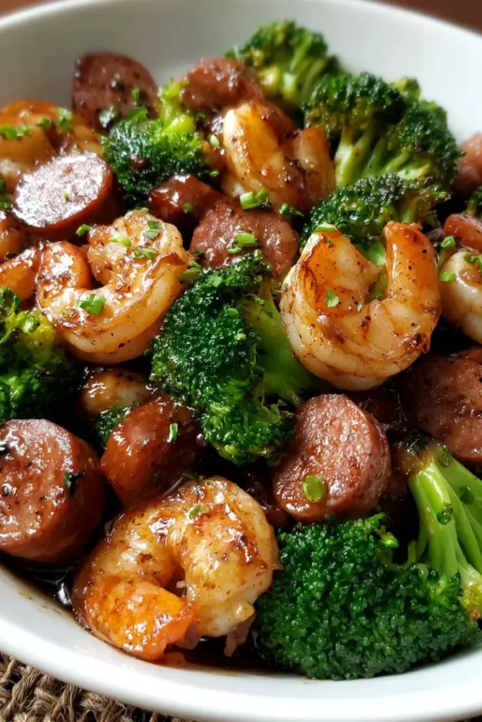 Let the mixture simmer for 2–3 minutes until the sauce thickens slightly and coats the shrimp, sausage, and broccoli.