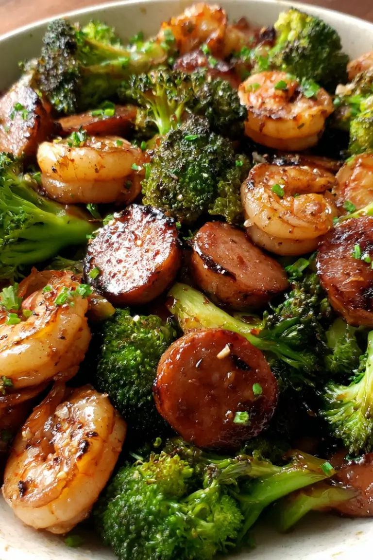 Let the mixture simmer for 2–3 minutes until the sauce thickens slightly and coats the shrimp, sausage, and broccoli.
