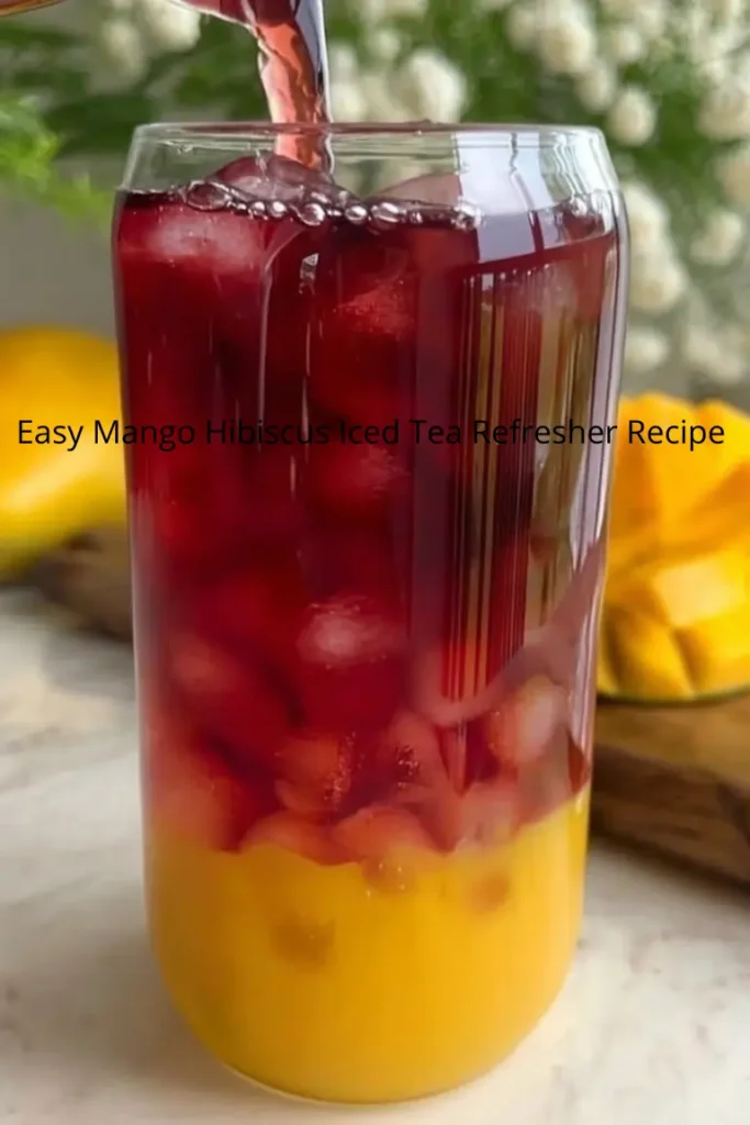 This Mango Hibiscus Iced Tea Refresher is one of those drinks that looks impressive but is surprisingly simple to make. The combination of sweet mango purée and tangy hibiscus tea creates a beautiful layered beverage that’s both refreshing and naturally flavorful.