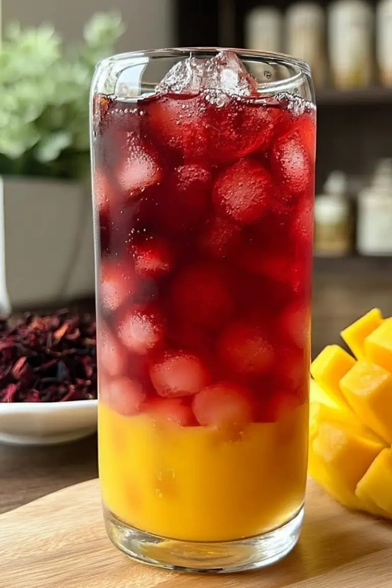 Hibiscus flowers create a deep ruby-red tea that contrasts beautifully with golden mango purée.