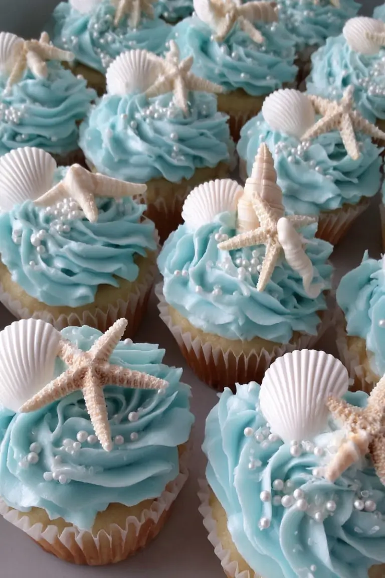These Easy Ocean Wave Cupcakes with Seashells are soft vanilla cupcakes topped with swirled blue-and-white buttercream frosting that mimics ocean waves. Decorated with edible pearls, candy seashells, and starfish, they’re a playful and eye-catching dessert perfect for beach parties, summer gatherings, and ocean-themed celebrations.