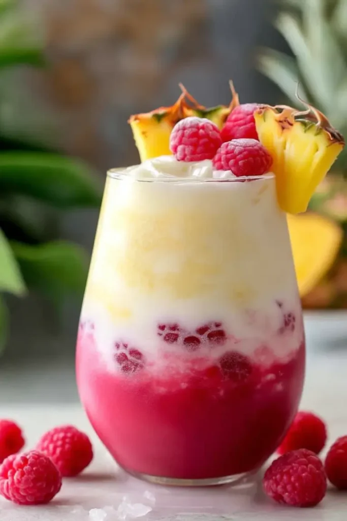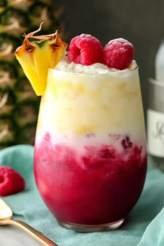 This Easy Raspberry Colada Twist is a vibrant layered mocktail made with tangy raspberries, tropical pineapple juice, and creamy coconut. The refreshing alcohol-free drink blends bright berry flavor with smooth tropical sweetness, creating a beautiful red-and-white layered beverage that’s perfect for summer gatherings, brunch, or a quick homemade treat.