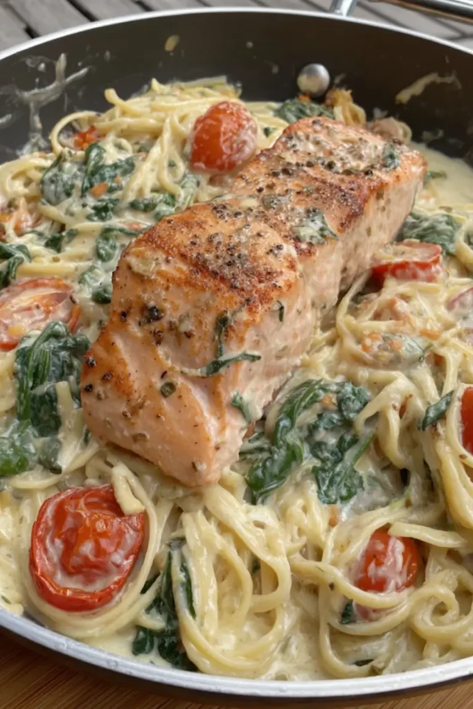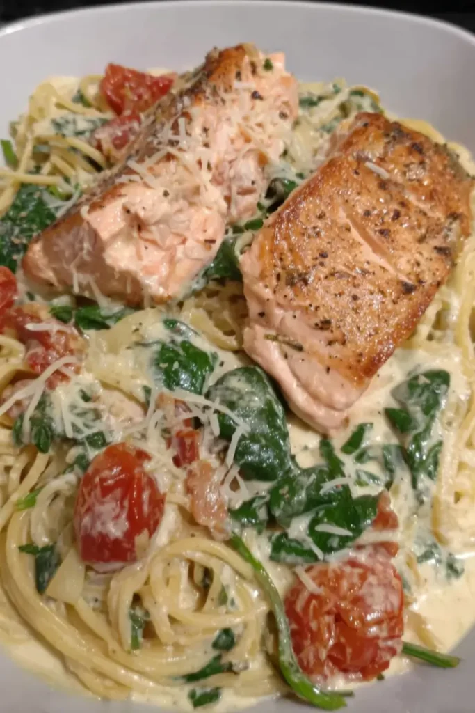 Second, it’s balanced. The richness of the cream sauce is brightened by juicy tomatoes and fresh spinach. The salmon adds protein and heart-healthy fats, turning a classic Alfredo into a complete meal.