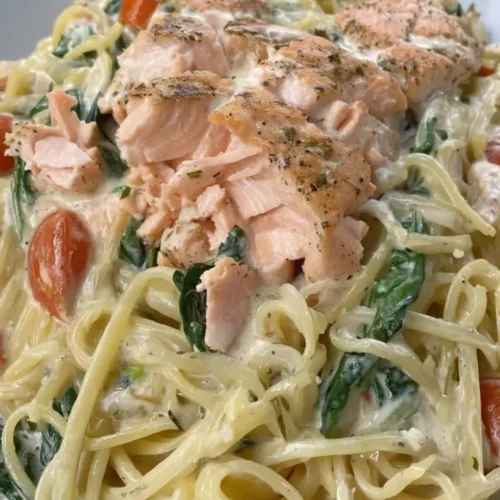 Easy Salmon Tomato Spinach Alfredo Pasta is the kind of creamy, comforting dinner that feels special but comes together with simple ingredients and minimal effort. Tender flakes of roasted salmon, sweet burst cherry tomatoes, and fresh spinach are folded into a rich Parmesan Alfredo sauce and tossed with perfectly cooked pasta. It’s a beautiful balance of fresh flavors and cozy texture — ideal for weeknights, casual gatherings, or whenever you want a satisfying homemade meal.