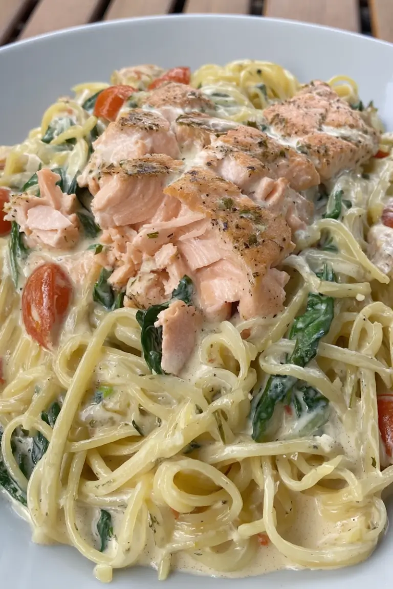 Easy Salmon Tomato Spinach Alfredo Pasta is the kind of creamy, comforting dinner that feels special but comes together with simple ingredients and minimal effort. Tender flakes of roasted salmon, sweet burst cherry tomatoes, and fresh spinach are folded into a rich Parmesan Alfredo sauce and tossed with perfectly cooked pasta. It’s a beautiful balance of fresh flavors and cozy texture — ideal for weeknights, casual gatherings, or whenever you want a satisfying homemade meal.