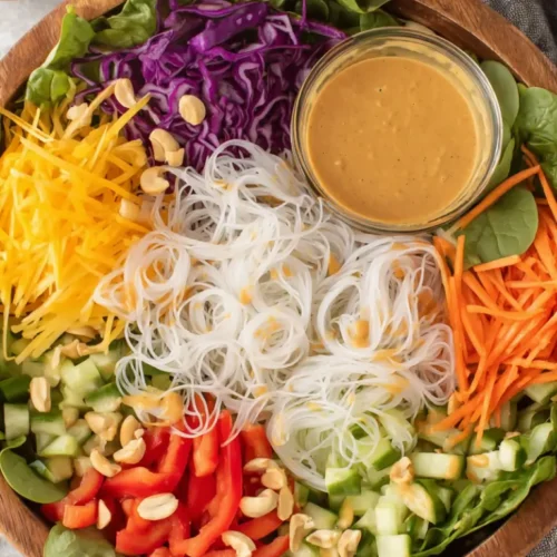 Easy Spring Roll Salad with Peanut Sauce delivers everything you love about fresh spring rolls—crunchy vegetables, tender noodles, bright herbs, and creamy peanut flavor—in a practical, no-roll format. It’s colorful, nourishing, and simple enough for weeknights, yet beautiful enough for entertaining.