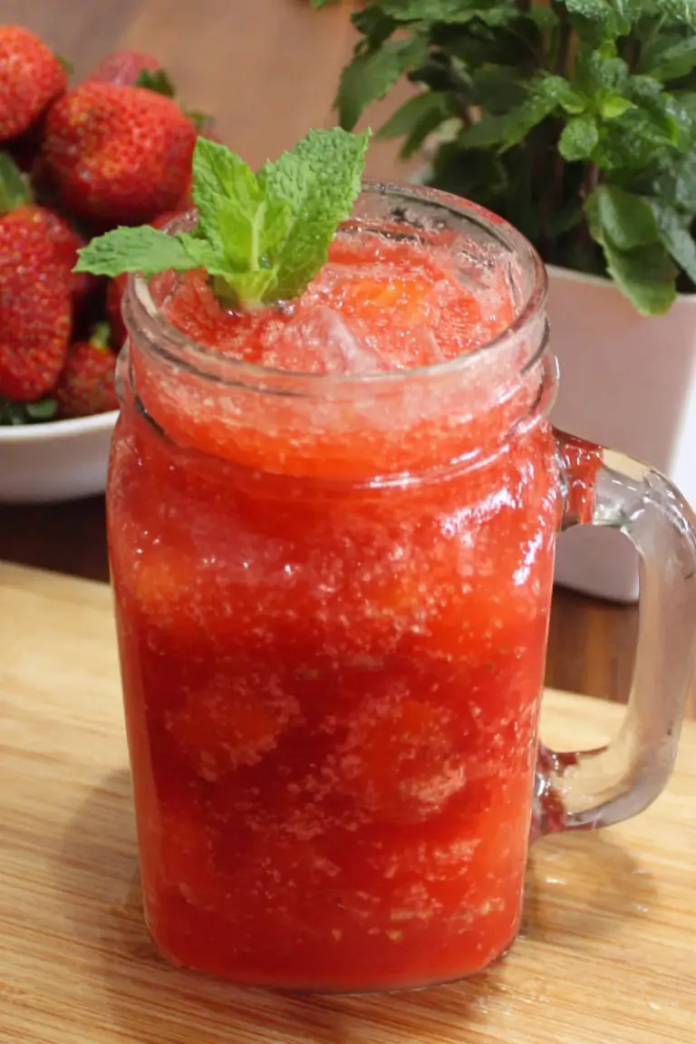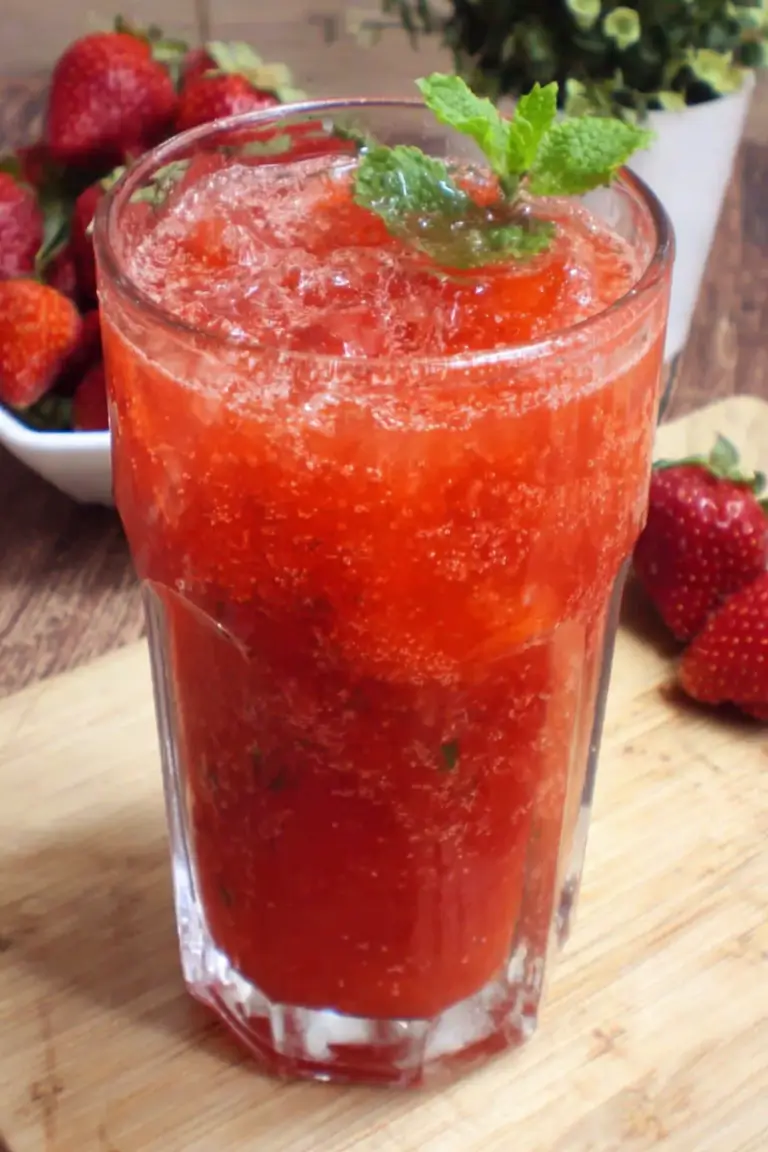 It’s a fizzy, fruity mocktail made with lemon-lime soda and strawberry syrup, often garnished with fresh fruit. The drink is non-alcoholic and easy to prepare at home.