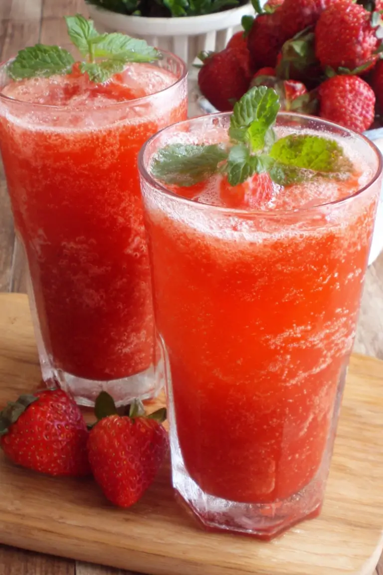 - Add fresh strawberry slices and a lime wedge or wheel on the rim of each glass. Serve immediately.