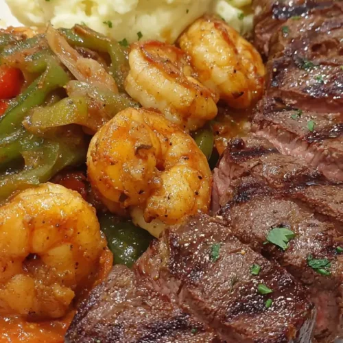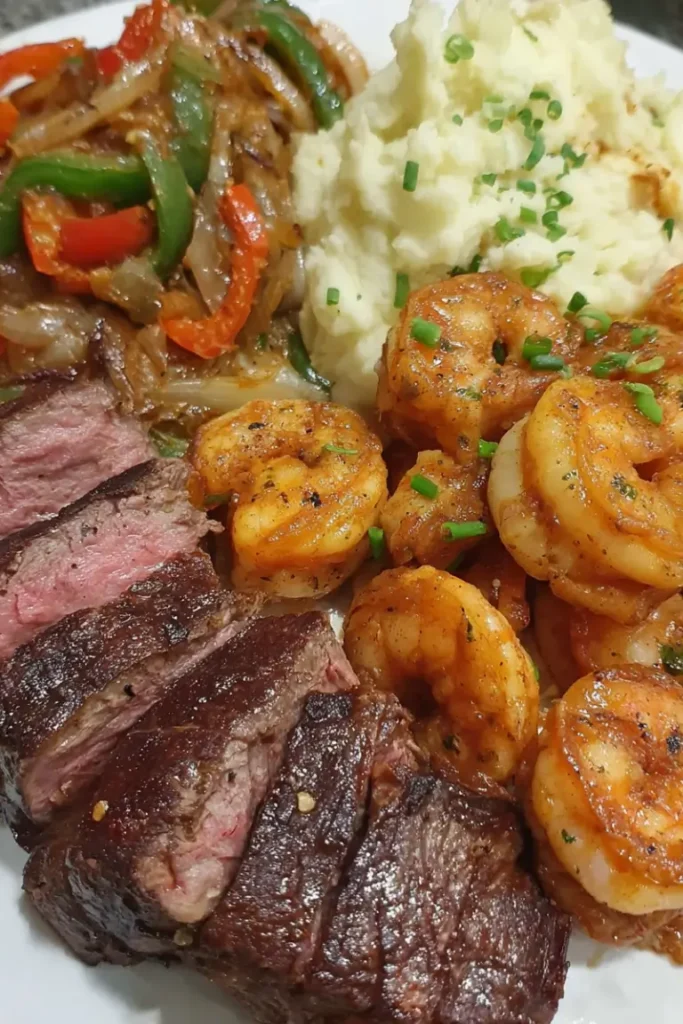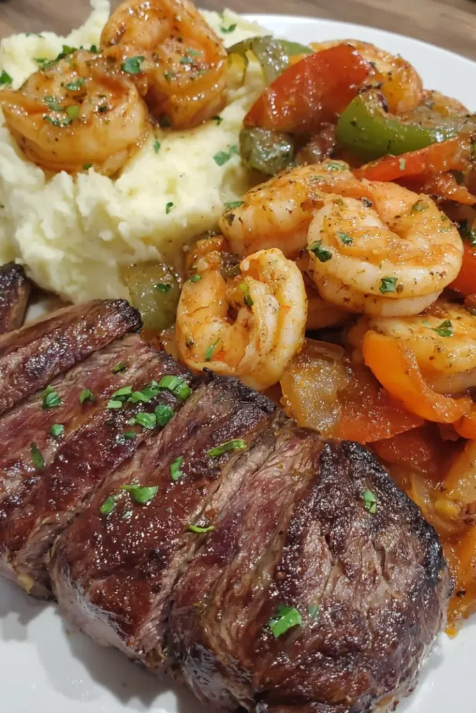 This surf-and-turf recipe is a perfect balance of flavors and textures. The rich, savory ribeye steak pairs beautifully with the slightly spicy Cajun shrimp. Creamy mashed potatoes add comfort and indulgence, while sautéed peppers and onions bring freshness and a touch of sweetness.