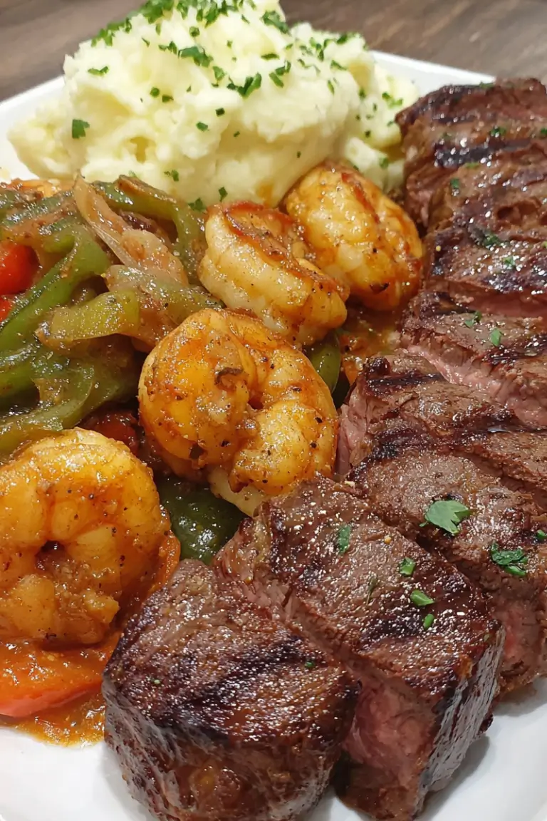 This surf-and-turf recipe is a perfect balance of flavors and textures. The rich, savory ribeye steak pairs beautifully with the slightly spicy Cajun shrimp. Creamy mashed potatoes add comfort and indulgence, while sautéed peppers and onions bring freshness and a touch of sweetness.