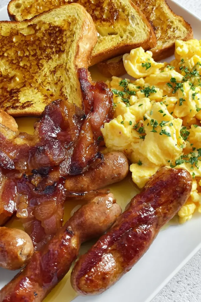 Arrange the French toast, scrambled eggs, crispy bacon, and sausages neatly on a large serving plate. Serve immediately with extra maple syrup on the side.