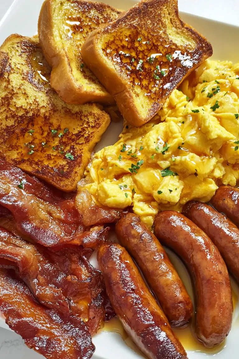 - Arrange French toast, scrambled eggs, bacon, and sausages on a platter. Serve warm with extra maple syrup.