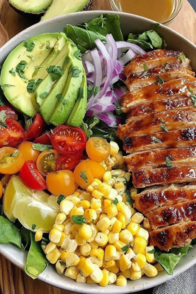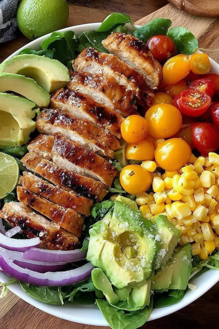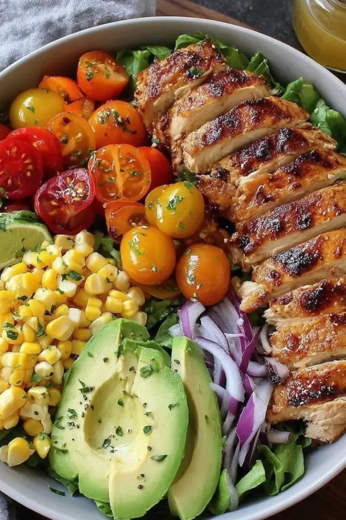 In a large bowl or serving platter, spread out the mixed greens as your base. Layer on the sliced grilled chicken, avocado slices, cherry tomatoes, sweet corn, and red onion.