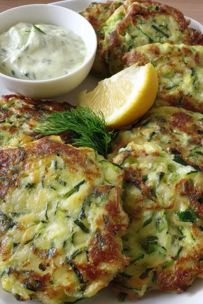 Serve the zucchini fritters warm with the creamy yogurt sauce on the side. Garnish with extra herbs if desired. These fritters are best enjoyed fresh but can also be served at room temperature for parties or gatherings.