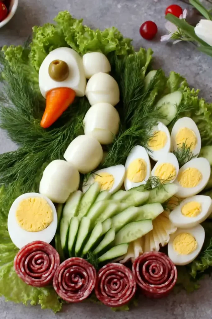 This elegant swan charcuterie board features beautifully crafted egg swans, delicate salami roses, and fresh vegetables arranged into a stunning, garden-inspired appetizer. Perfect for parties, brunches, and special occasions.