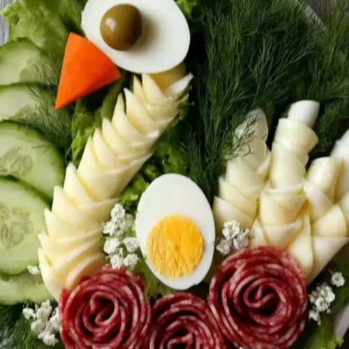 2. Arrange cucumber slices, lettuce leaves, and dill sprigs around swans and salami roses.