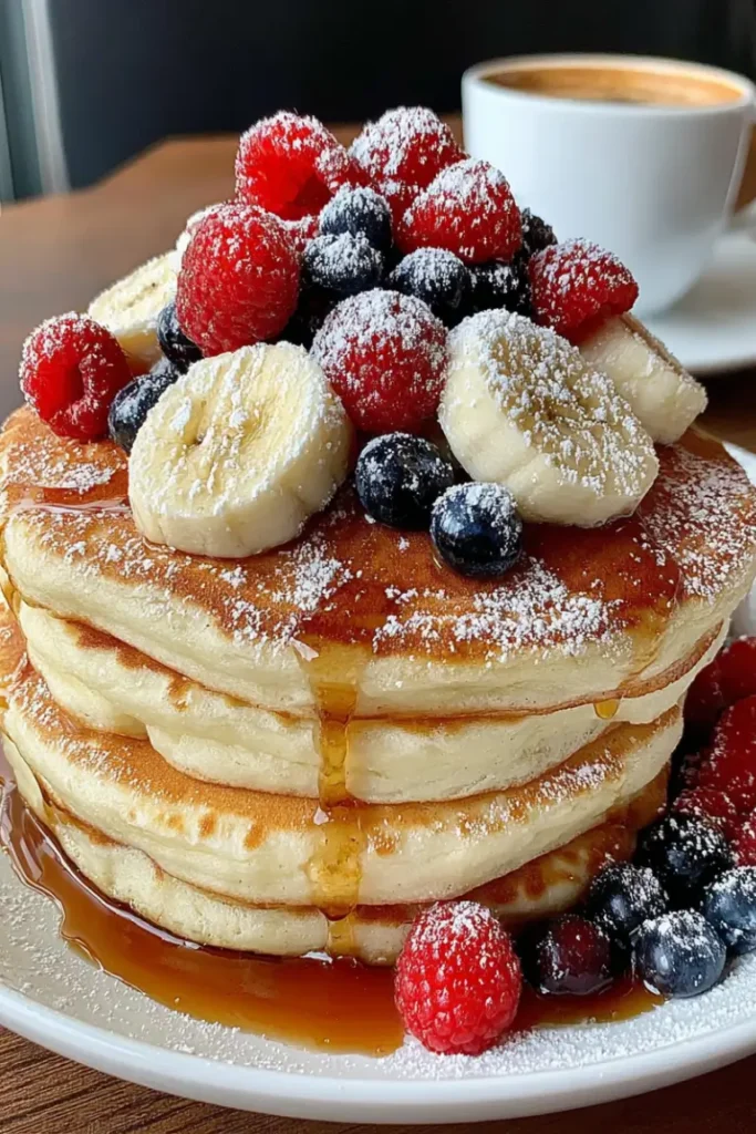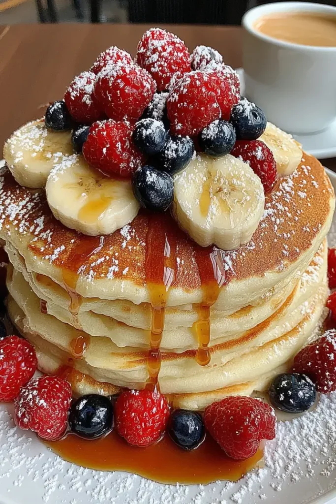 - Stack pancakes on a plate, top with raspberries, blueberries, and banana slices. Dust with powdered sugar and drizzle with maple syrup. Serve immediately.