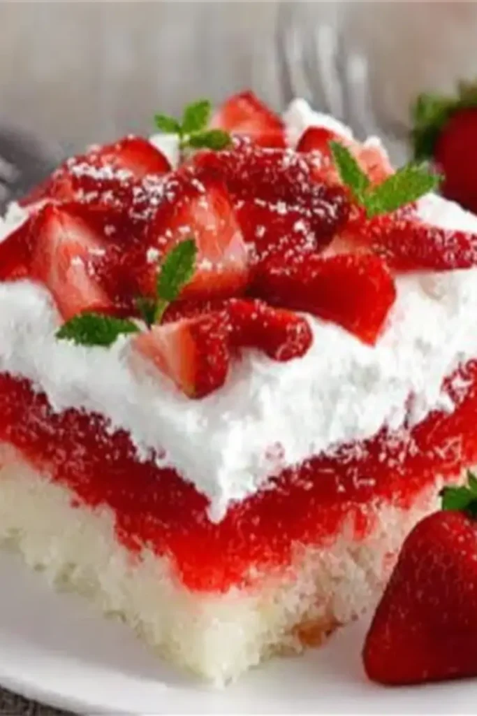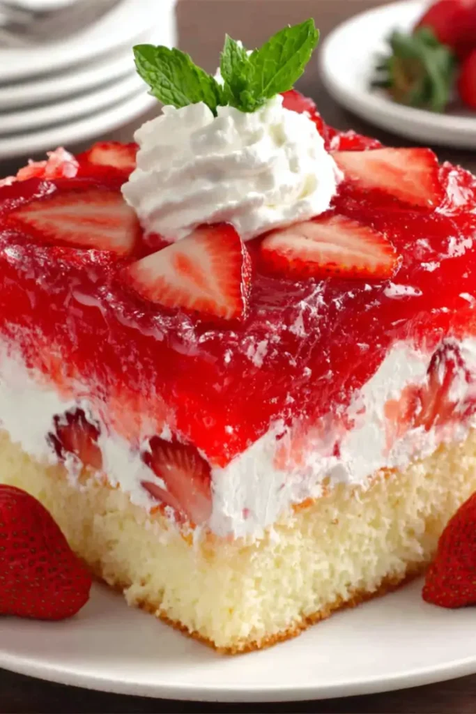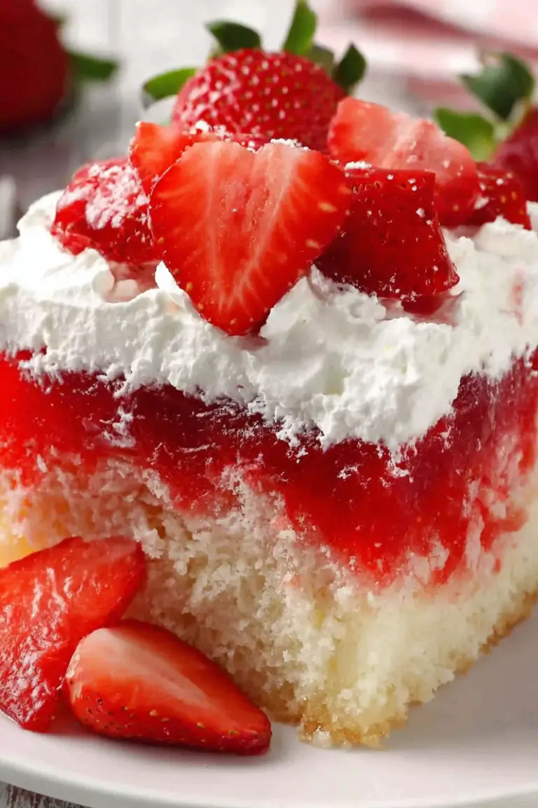 This cake is all about simplicity and flavor. It starts with a soft, fluffy cake base that absorbs a vibrant strawberry gelatin mixture, creating a moist and colorful dessert. The creamy topping and fresh strawberries add the perfect finishing touch.