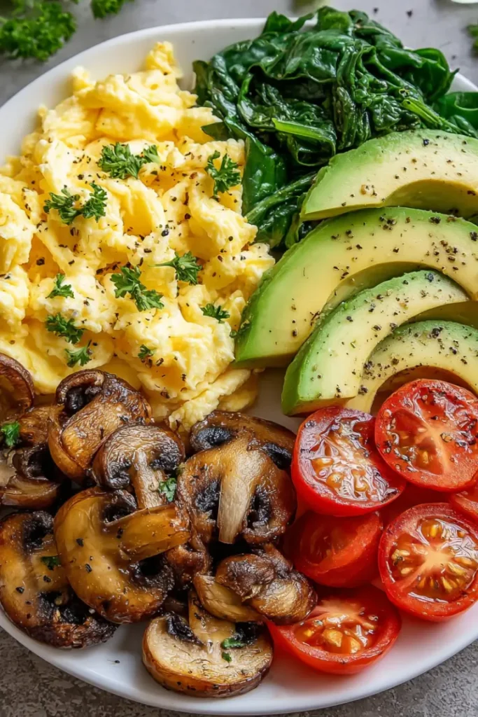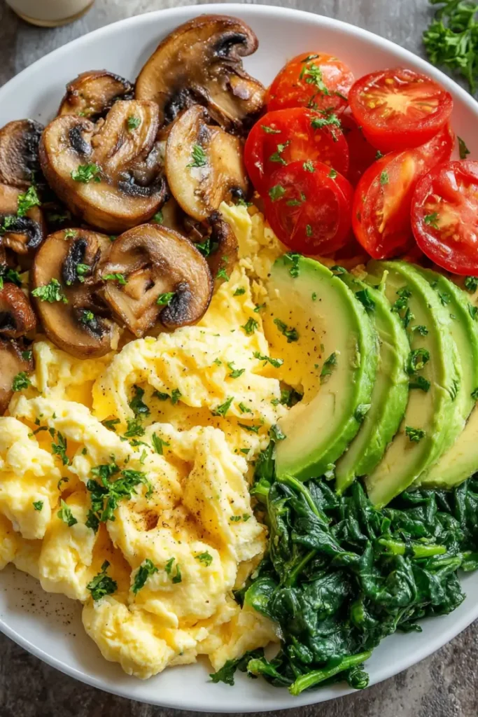 - Assemble plate: place scrambled eggs, sautéed vegetables, sliced avocado, and tomato. Garnish with parsley or chives and serve immediately.