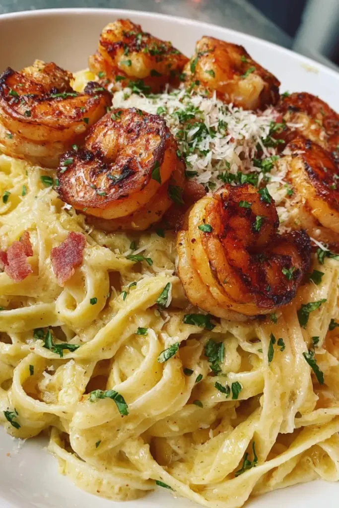 • Add the drained fettuccine to the sauce and toss until fully coated. Plate the pasta and top with seared shrimp. Garnish with chopped parsley and extra Parmesan if desired. Serve immediately while warm and creamy.