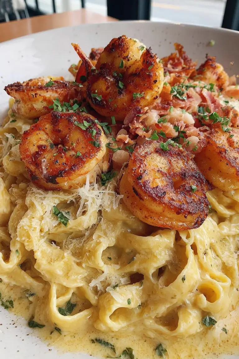 • Add the drained fettuccine to the sauce and toss until fully coated. Plate the pasta and top with seared shrimp. Garnish with chopped parsley and extra Parmesan if desired. Serve immediately while warm and creamy.