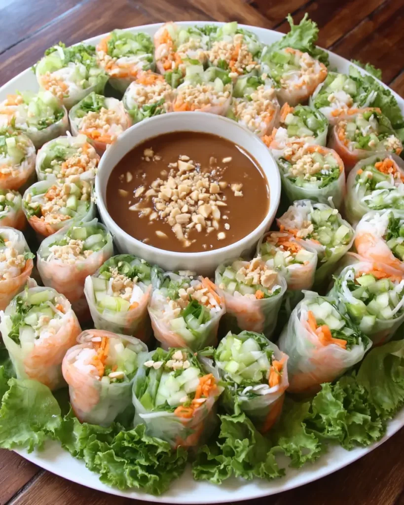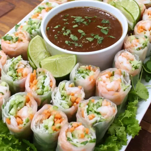 Fresh shrimp spring rolls with peanut sauce are the perfect light and vibrant dish when you want something quick, healthy, and full of flavor. These Vietnamese-inspired rolls are packed with tender shrimp, crisp vegetables, and fragrant herbs, all wrapped in delicate rice paper and served with a creamy, savory-sweet peanut dipping sauce.