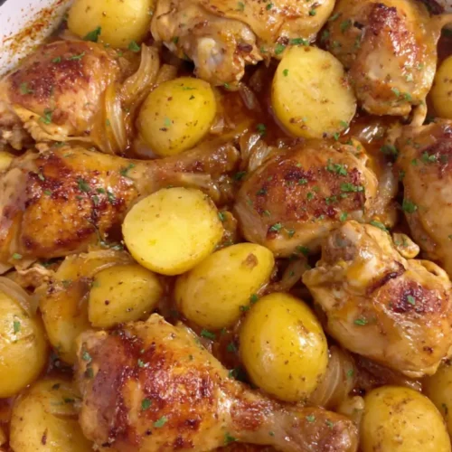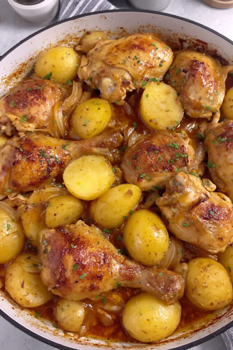 - Bake for 55–65 minutes, or until the chicken reaches 165°F (74°C) and potatoes are tender. Broil 2–3 minutes for extra golden color.