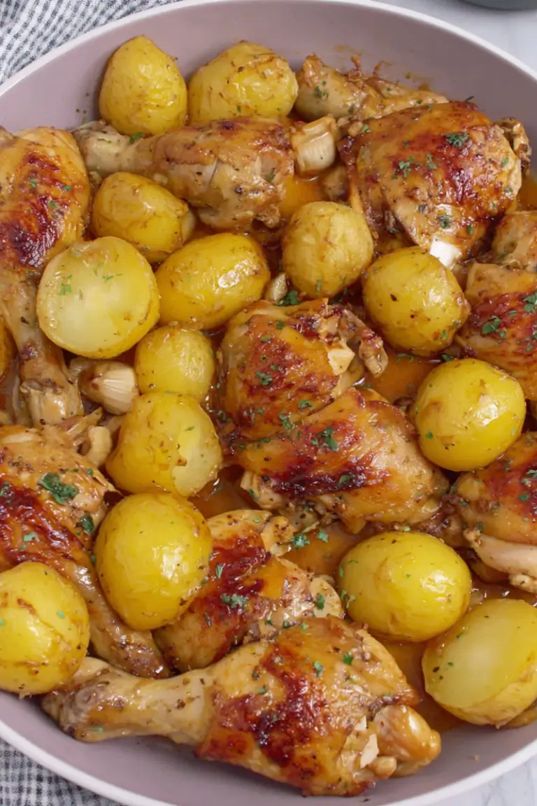 Place the chicken in a large baking dish or roasting pan. Add the halved potatoes and drizzle the lemon-garlic sauce over everything. Toss gently to coat evenly. Spread the chicken and potatoes in a single layer to ensure even roasting.