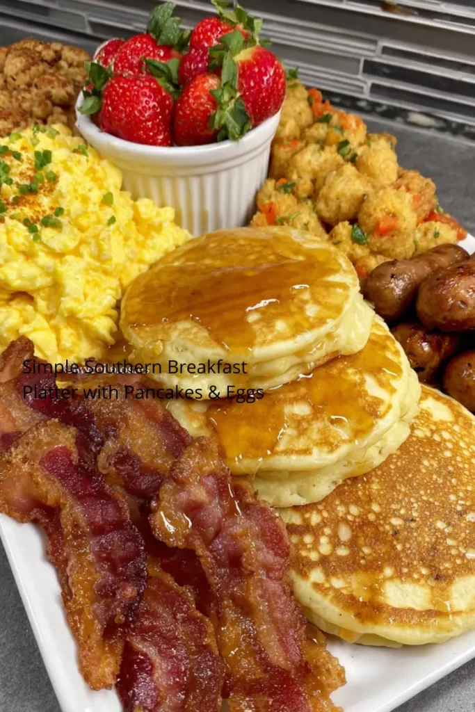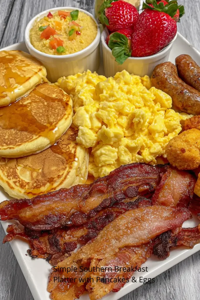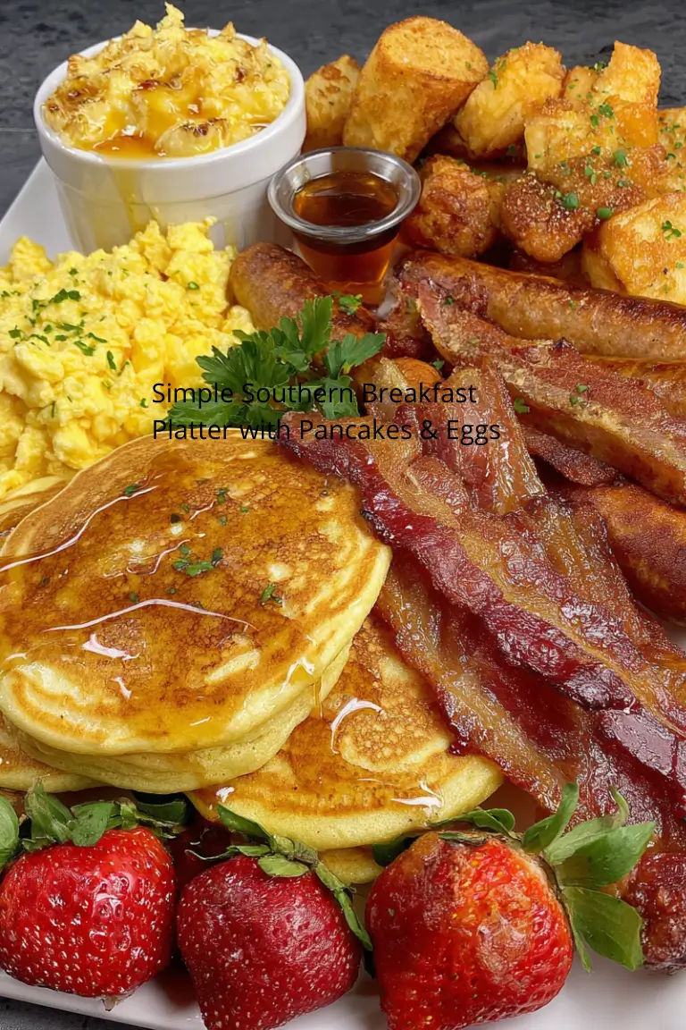 A Simple Southern Breakfast Platter with Pancakes & Eggs is the kind of meal that brings warmth and comfort to the table. The combination of fluffy pancakes, creamy cheesy grits, savory sausage, and soft scrambled eggs creates a breakfast that feels both traditional and satisfying.